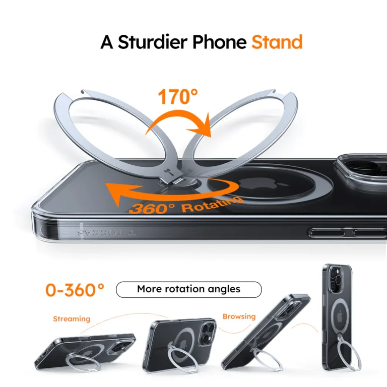 - 360° Adjustable Stand: Aluminum alloy kickstand rotates for both portrait (30°–90°) and landscape (15°–165°) viewing.